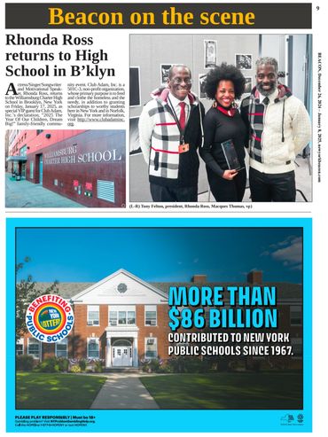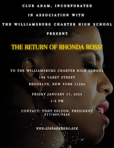 AS A PART OF OUR 2024 DECLARATION, THE YEAR OF OUR CHILDREN!, CLUB ADAM, INCORPORATED IS HONORED TO ANNOUNCE THE RHONDA ROSS EVENT AT THE WILLAIMSBURG CHARTER HIGH SCHOOL. RHONDA ROSS IS THE DAUGHTER OF LEGENDARY MEGA STAR, DIANA ROSS, AND THE FOUNDER OF MOTOWN RECORDS, BERRY GORDY, JR.